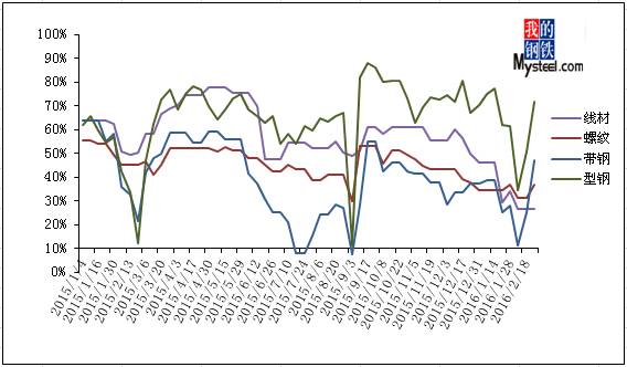 节后下游钢厂开工率有不同程度上升:据不完全统计(2月19日-2月25日)唐山线材57条生产线,检修42条,产能利用率为26.6%,较上周持平,影响产量约42.57万吨;唐山50条螺纹生产线,检修36条,产能利用率为36.79%,较上周上升5.83%。本周影响产量约30.34万吨。