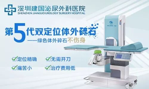 治疗肾结石,深圳建国泌尿外科医院采用“第五代双定位体外冲击波碎石技术”进行治疗,第五代双定位体外冲击波碎石技术对冲击波在不同物质中传递时的不同阻抗加以利用,当冲击波抵达结石时由于阻抗不同产生一定的压强,对结石产生破坏力;而在冲击波离开结石时,又由于阻抗的不同发生反向,产生拉抻力对结石造成破坏,这种反复轰击多次后结石即可逐渐被粉碎。