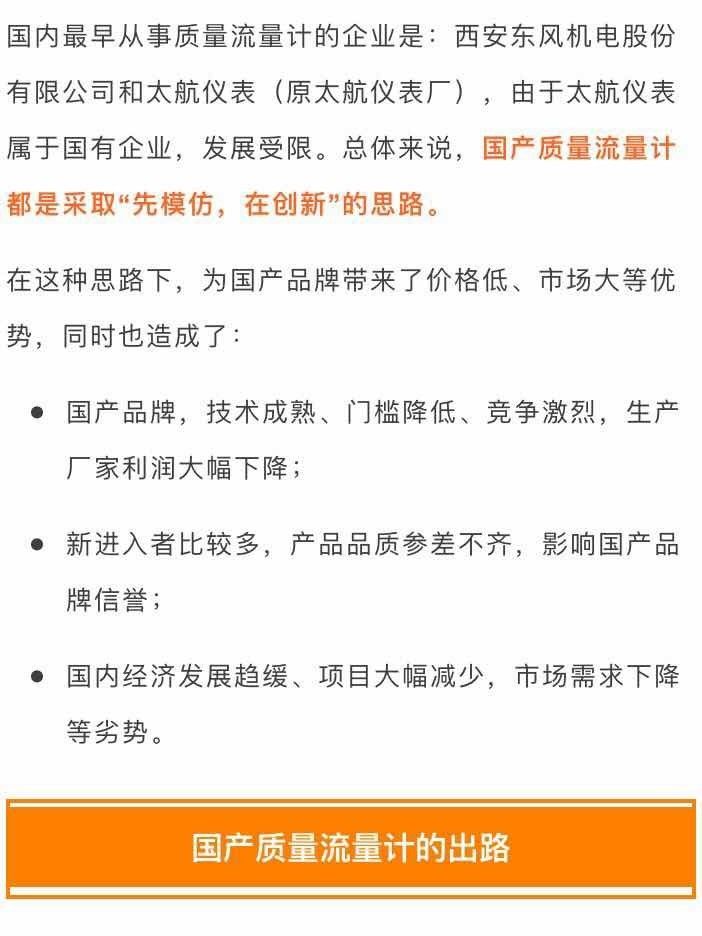 每10台质量流量计9台进口1台国产,国产质量流量计市场机会仍然很大,只有不断提高产品性能、扩宽产品线、定制化产品并逐步提高产品智能化,方能在竞争中有一席之地,并找到国产质量流量计的出路。在这篇文章中,现任西安东风机电有限公司的董事长任卫东先生,将和大家介绍进口质量计近几年的发展方向,并给出国产产品市场突围的建议。