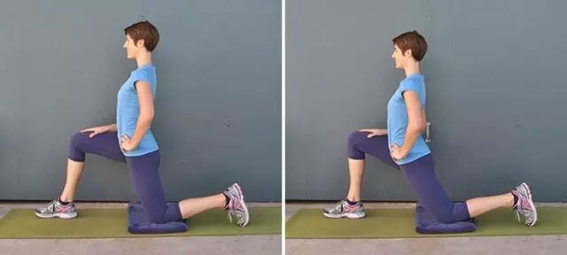 以猛冲向前的姿势开始,右腿向前,左膝置于地板上。挤压左侧大腿,慢慢将骨盆压向前以加大拉伸的力度。坚持30-45秒,然后换另一边。