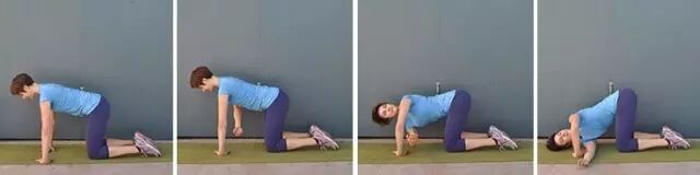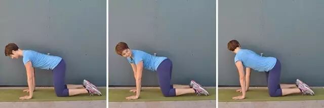 开始时,双手与膝盖着地,背部放平。肩膀在手腕上方,臀部则在膝盖上方。摆动臀部朝向右侧,视线看向右臀。恢复到原来的姿势。然后摆动臀部朝向左侧,视线看向左臀。两侧交替进行,重复10组。
