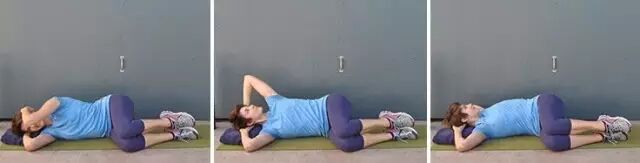 开始时,侧躺朝向右边,屈膝,并在一起,双臂从胸部位置向外伸。转动上身,左臂朝向天花板,保持臀部和膝盖不动。继续转动,以打开胸部,使左臂向地板方向移动。重复做4组,然后换另一边。