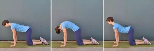 开始时,双手与膝盖着地,背部放平。肩膀在手腕上方,臀部则在膝盖上方。向上拱起背部,朝向天花板,保持这个姿势做一次吸气呼气。背部向下拱,朝向胸部,尾骨朝向天花板,保持这个姿势做一次吸气呼气。这两种相反的姿势视作一组动作。猫式和奶牛式交替进行,做10组。