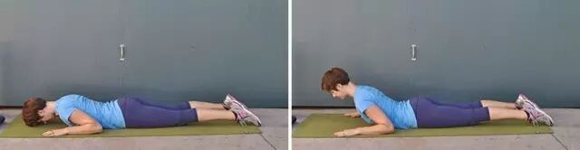 开始时,俯卧,双腿并拢,双手置于两侧胸部的位置。当双手用力,胸部和头部抬起的时候,脚不能离开地板。保持这个姿势做1组吸气呼气,使肚脐向脊柱靠近。慢慢放低。重复5-10次。