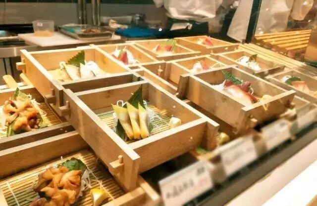 一进门,就能看见通透的厨房与菜品柜台。非常干净大气,柜台呈波浪形,包括寿司、刺身、铁板、西点、定食等菜品区,想吃什么都能找到。