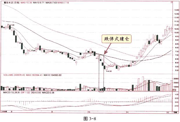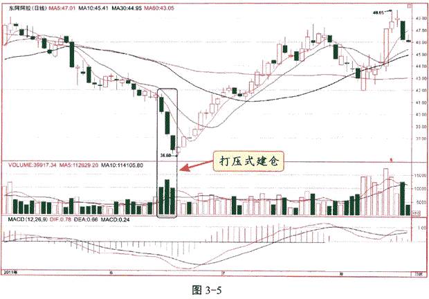 庄家运用手中已有的筹码,不计成本地大幅向下砸盘,令股价连续下挫,使散户在心理上完全崩溃,纷纷斩仓出局,庄家则照单全收。有的庄家甚至趁着大盘深幅回调、股价向下破位或个股出现利空时,进行打压建仓,效果更加明显,如图3-5所示。打压式建仓并不能随意使用,若市场处于牛市中,且股价保持强劲的上涨走势,此时打压建仓,只会给投资者以逢低买入的机会。散户应对技巧:1.庄家打压建仓期间,不可随意抄底。2.在打压初期,若有筹码浅套其中,可先斩仓出局,待低点再接回。
