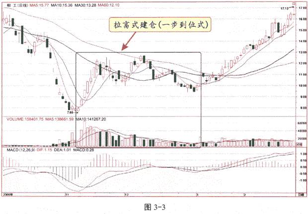 1.一步到位式。庄家介入后,将股价从低位急速拉升,甚至用涨停板的方式逼空建仓。股价拉至相对高位后形成平台、旗形或三角形等整理态势,此时散户往往会抛出短线获利盘、前期套牢盘,庄家则悄悄接纳抛出的筹码,以达到建仓的日的,如图3-3所示。