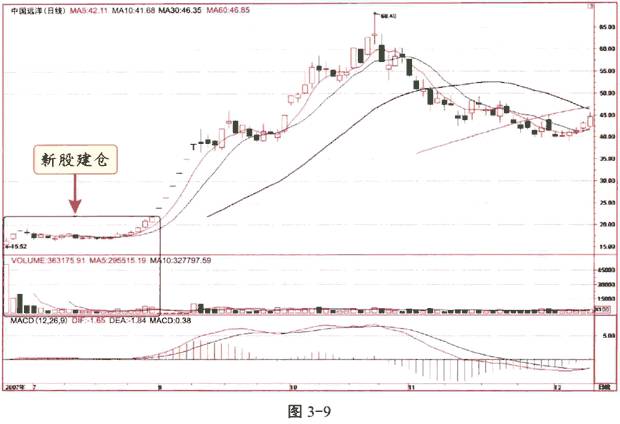 庄家炒作新股时,一般会在新股上市后的前几天快速、大量地收集筹码。因为散户对新股不是很了解,一般都不敢轻易买进,而中签的投资者,大多数都会在上市当天获利了结,所以庄家可以较容易地完成建仓任务,如图3-9所示。散户应对技巧:1.若新股上市当天或随后几天内被大幅炒作,投资者应持谨慎的态度,不要轻易跟进。2.在新股上市时,若大盘经历了一段大幅上涨,则新股日后炒作的空间将会缩小,投资者应谨慎对待;若大盘经历了大幅的下跌,则新股的定位就会偏低,日后有一定的炒作空间。