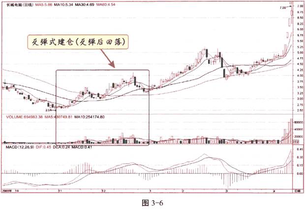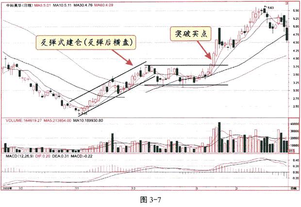 由于庄家无法在底部吸到足够的筹码,为了节省吸筹时间,便采用了反弹式建仓。这是庄家利用投资者“高抛低吸”“抢反弹出货”“逢高减磅”的心理,来吃进筹码,从而快速完成建仓任务。反弹到位后,庄家一般采取以下两种策略吸筹:
