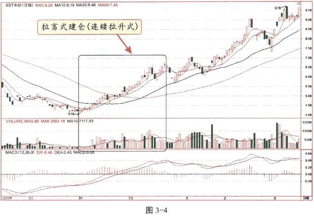 2.连续拉升式。股价长期下跌后,逐渐形成底部,投资者产生惜售心理,庄家无法在底部收集足够的筹码。为了尽快吸筹,庄家连续拉高股价,日K线陡峭上行,乖离率极大。同时,庄家制造震荡的走势,引发散户抛盘,庄家则暗中吸筹,如图3-4所示。散户应对技巧:低位介入的投资者,可以先逢高获利离场,待股价整理结束,重新放量上攻时,再及时跟进。