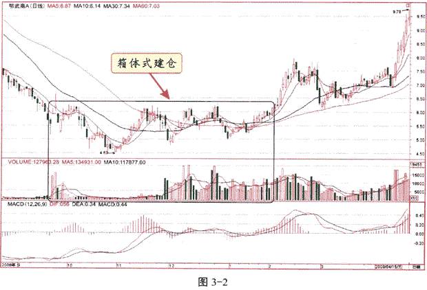 庄家用这种方式建仓,股价走势往往表现为长期在一个箱体内上下波动,当股价上升至某一高点,盘中就会出现抛盘令股价回落,而一旦股价跌到某一低点,盘中即有买盘介入令股价回升。在成交量上,一般表现为股价上涨时成交量放大,而股价回落时成交量萎缩。若某只股票在箱体内上下震荡的次数越多,周期越短,则证明其是庄股的可靠性就越高。有时候在波动的过程中,成交量突然放大或单笔成交量异常放大,都是庄家主动买入的迹象。庄家用这种方式建仓,往往可以把自己的建仓成本控制在一个特定的区间内,如图3-2所示。散户应对技巧:1.有经验的短线高手可在箱体内高抛低吸,赚取差价。2.一般的散户可在股价向上突破箱体后介入。
