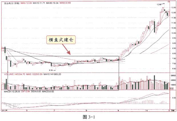横盘式建仓一般出现在股价长期下跌之后。庄家在低位暗中吸筹,只要市场上有抛单,庄家就会一一通吃,但只要股价稍有上升,庄家就会用大单把股价打压下去。因此,股价长期在一个窄小的区域内波动,形成横向盘整格局。很多散户因手中筹码长时间横盘而失去耐心,纷纷割肉去追强势股,庄家则趁机悄悄吸纳这些廉价筹码,逐步完成建仓工作。这种横盘式建仓的时间一般要在3个月以上,有的长达半年甚至更长。横盘吸筹期间,每日的成交量虽然不大,但累计成交量却非常可观。这种股票一旦启动,涨势往往十分惊人,如图3-1所示。散户应对技巧:横盘期间,不应盲目介入,可以在股价放量向上突破盘整格局时再买入。