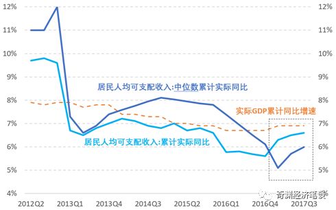 其一,居民人均可支配收入增速当中,中位数增速降幅明显。2016年之前的多年,城镇居民家庭人均可支配收入的中位数增速,大部分时候都能跑赢GDP增速,即便是实际增速口径也是如此。但2016年末以来,居民收入的中位数增速明显下降。截至2017年3季度,居民收入中位数累计实际同比增速,不仅持续多个季度低于居民人均收入的同口径增速,而且同时,也持续低于实际GDP的累计同比增速。