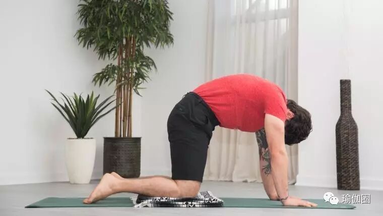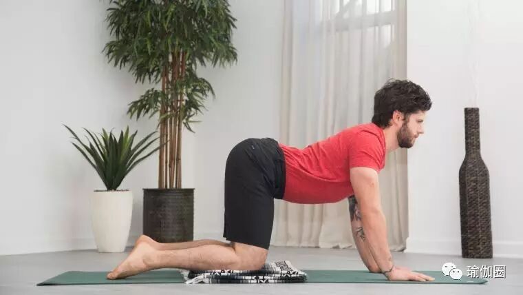 • 呼气,低头,腰背部向上拱起,腰部向上用力,手推肩向上,帮助背部最大程度向上拱起,为身体创造更大的空间。