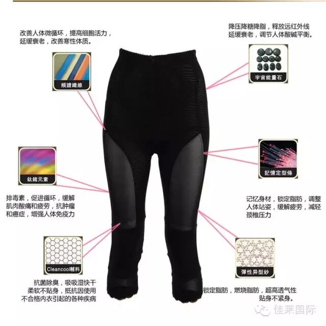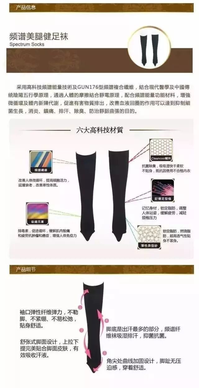 采用高科技频谱能量技术及GNU176型频谱符合纤维,结合现代医学及中国传统阴阳五行学原理,通过人体的摩擦结合静电原理,配合频谱能量功能材料,增强微循环及体内新陈代谢,促进有害物质排出,改善血液回圈的作用可以达到抑制细菌生长,消炎、镇痛、排汗、除臭、防治静脉曲张的目的。