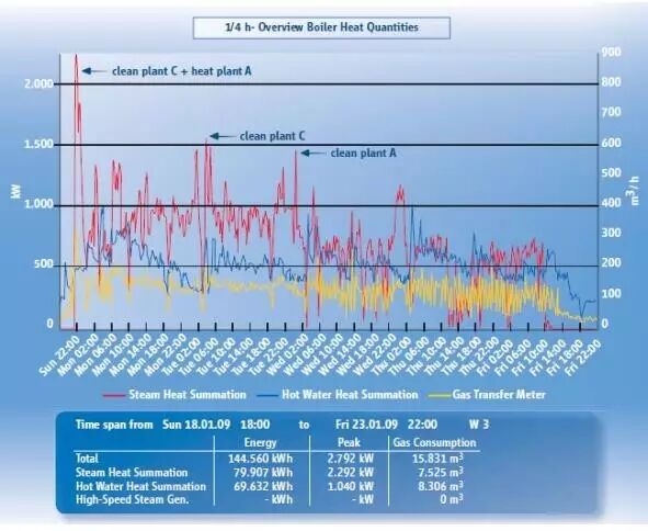 热量表分别安装在锅炉房,以确定热水的能量消耗。蒸汽流量计,燃气表用于测量各个燃气锅炉的消耗,电表安装在变压器输出以及各个单元。所有表都连接到现有的总线系统,并集成到能源管理系统。半年过去后,为投资决策已经收集了足够的数据。评估表明:较小的蒸汽锅炉有4吨/小时的输出就足够了。现有的热水锅炉容量为2.400千瓦,在冬季是吸收加热需求高峰,而旧锅炉可保留作为备份。
