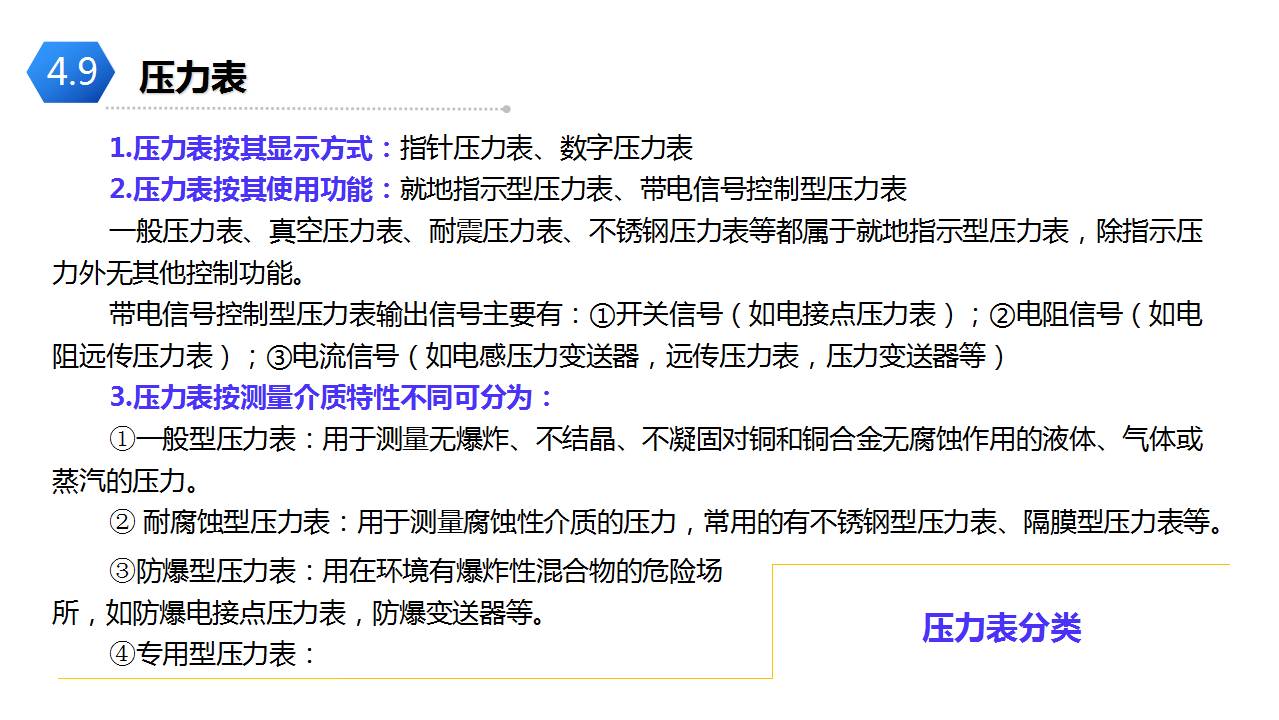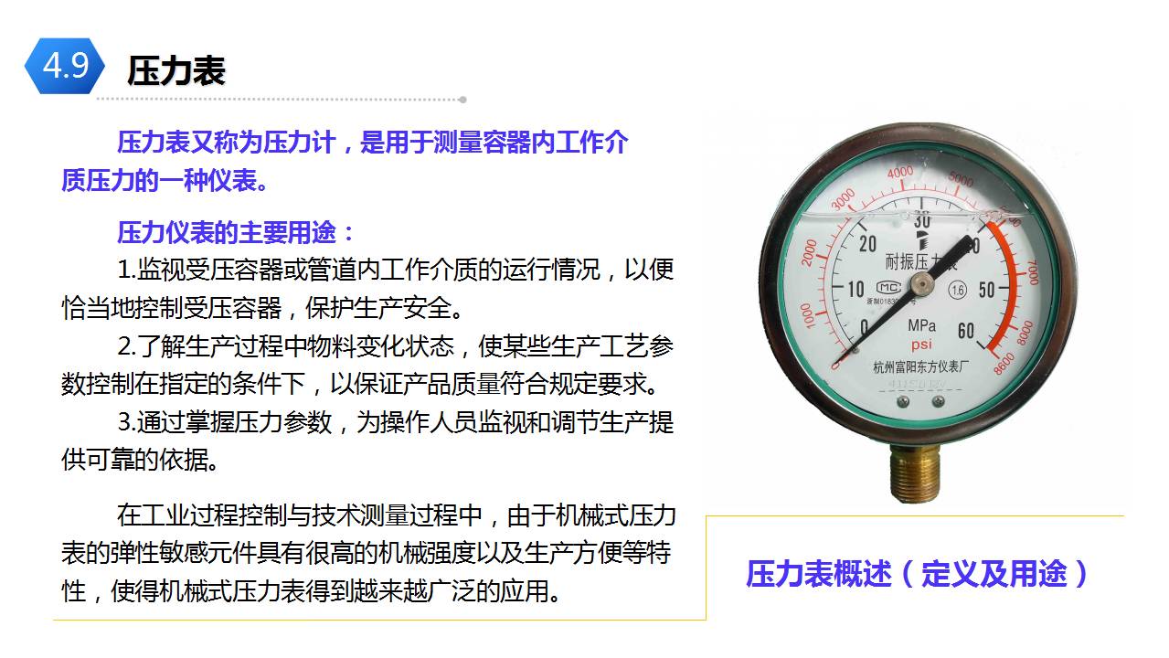 1.监视受压容器或管道内工作介质的运行情况,以便恰当地控制受压容器,保护生产安全。