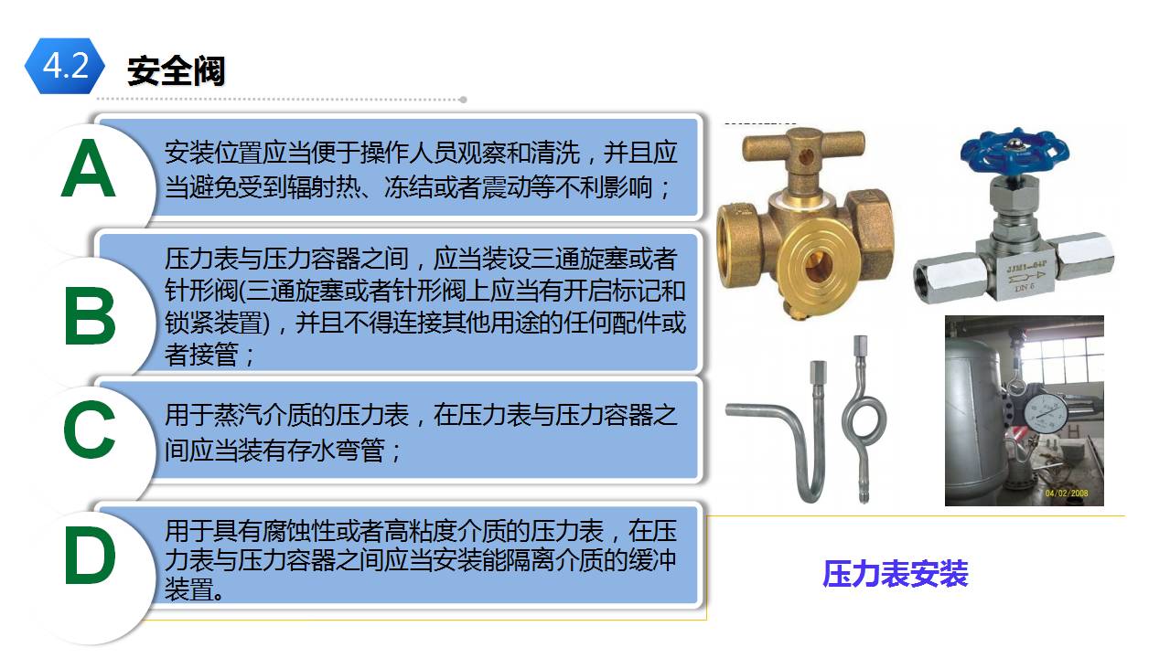 (4)在压力表和压力容器之间装设三通旋塞或者针形阀时,其位置、开启标记及其锁紧装置是否符合规定;
