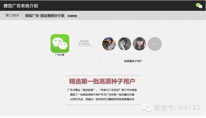 这就是朋友圈广告的特别之处了,广告首先会优先展示给一批“高质种子用户”,这批用户有一些特点,就是“朋友圈高活跃庆”,“经常参与广告互动”。