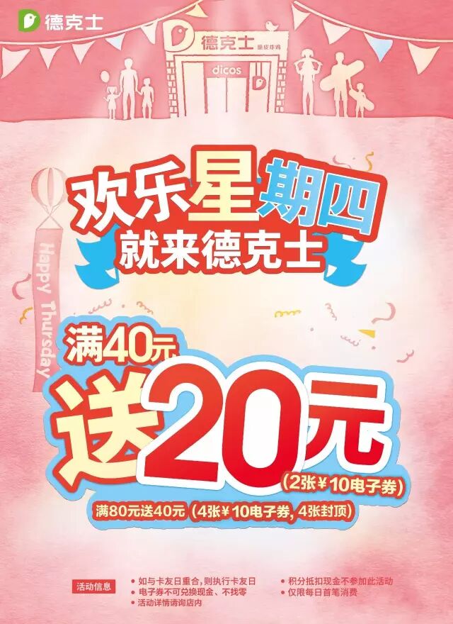 2、活动当天首笔消费满40元,可额外获赠20元代金券,满80元送4张10元代金券(4张封顶),积分支付及电子券消费除外;