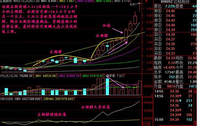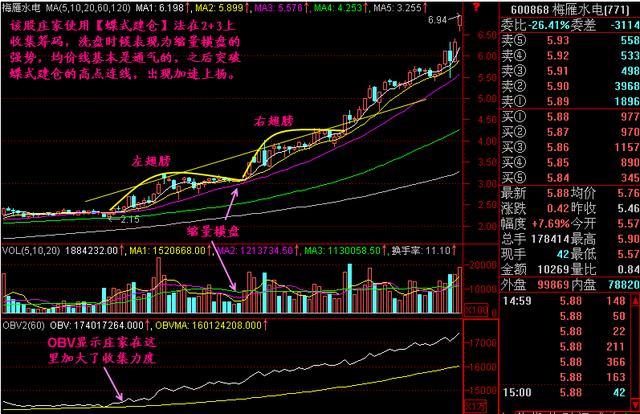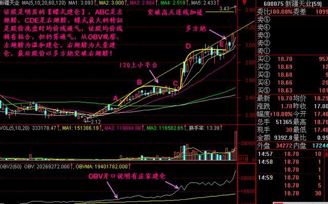 1、该股是明显的蝶式建仓,abc是在左翅膀,cde是右翅膀,蝶式最大的特征是股价洗盘时均价线通气,从obv观察,左翅膀为温和建仓,右翅膀为大量建仓,最后股价以多方炮突破右翅膀。