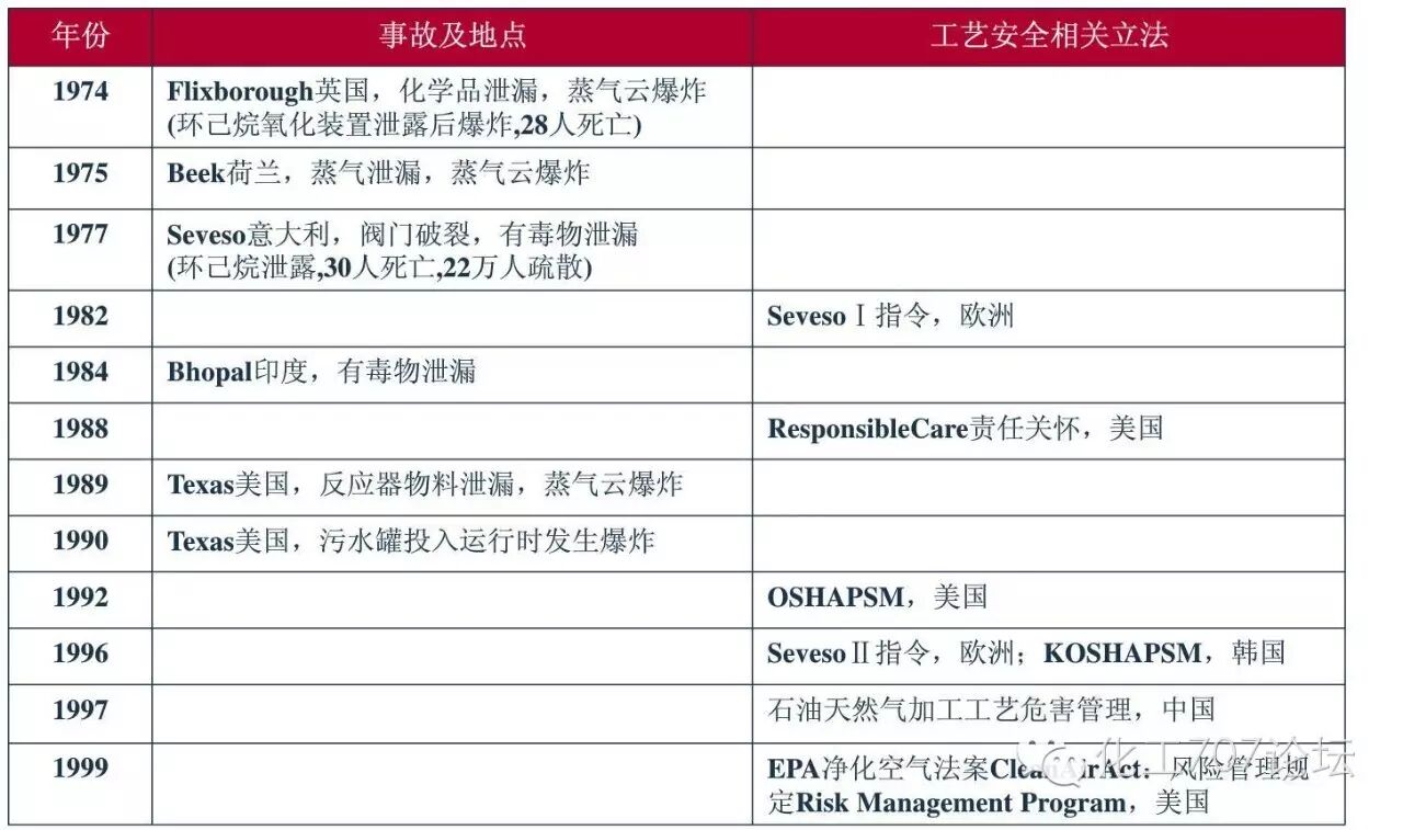 在20世纪80年代发生了一系列的严重事故,例如印度博帕尔的有毒气体泄漏事件,针对这些,第一部工艺安全管理(PSM)的法规得以出台。美国最重要的工艺安全管理(PSM)法规是职业安全及健康管理局(OSHA)于1992年颁布的29CFR1910.119高度危险化学品的工艺安全管理。。此外有一些州制订了自己的工艺安全管理(PSM)法规,包括:新泽西州的毒害物灾难防治法(1986年);特拉华州剧毒物风险管理法(1989年);内华达州的化学品事故预防管理(CAPP)。各种专业协会还建立了不同的工艺安全管理(PSM)标准和指导程序,如美国石油学会(API)的建议实践750。各种专业公司和社团组织过与工艺安全管理(PSM)相关的各种研讨会,如化工工艺安全中心、“成功工厂”和石油工程师协会等。