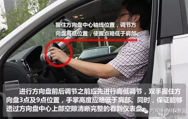 1. 在进行方向盘前后调节之前应先进行高低调节,此时在座椅位置固定的情况下尽量保证能够透过方向盘中心上方的空隙中,清晰完整的看到仪表盘内信息。此外,双手握住方向盘3点及9点位置,手掌高度应略低于肩部。过高的握点可能在长时间的驾驶下造成肩部的酸痛。