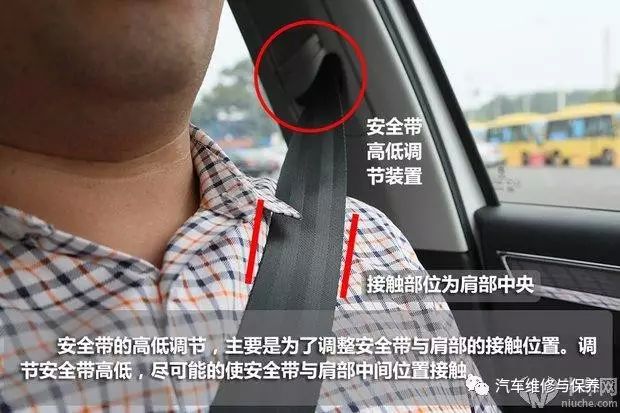 1. 安全带的高低调节,主要是为了调整安全带与肩部的接触位置。调节安全带高低,尽可能的使安全带与肩部中间接触,不能过于接近颈部也不能过于靠外,以避免安全带在碰撞当中对肩部以及颈部的损伤。