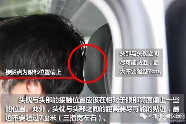 3. 头枕的调节同样重要,不正确的头枕位置会在发生危险时以更大的冲击拍打不正确的头部位置造成伤害。首先,头枕与头部的接触位置应该在相对于眼部高度偏上一些的位置。此外,头枕与头部之间的距离要尽可能的贴近,最远不要超过7厘米(三指宽左右),否则在碰撞时头枕会对头部产生严重的撞击,如果头枕前后距离无法调节,需要尽可能的通过座椅靠背角度来辅助调节。