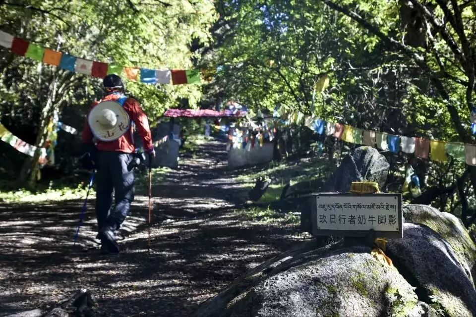 轻装走起来是要舒服一些,1个小时就快到贡嘎寺了,穿贡嘎大环线几次了,每次都对这个玖日行者奶牛脚影印象深刻。我专门去百度了一下,据说这是转经路上的神迹,都有着奇怪的名字,比如:玖日行者奶牛脚影,制伏乾达婆者半面马头,制伏地神者半面猪头……