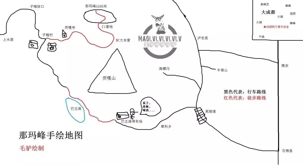 如图,是我们的行军路线,黑色为行车路线,红色为徒步路线。一图在手,世界有我。(请原谅我的手绘技术,已经尽力了?)