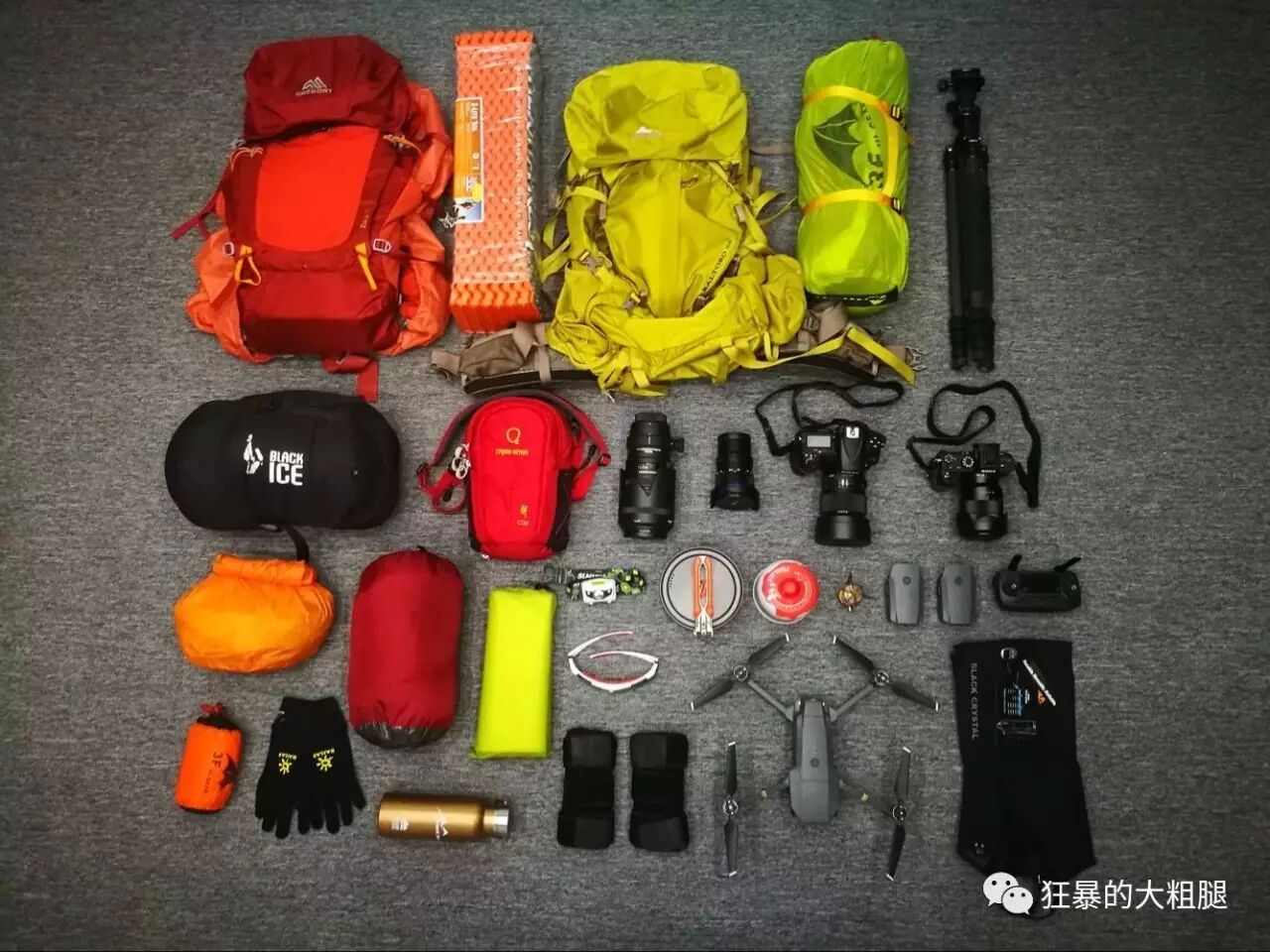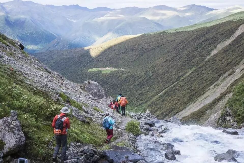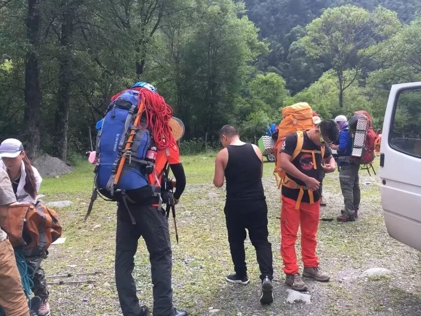 我们早上8点从成都出发,下午2点到达草科乡徒步起点,收拾装备,进军!看装备,不晓得的还以为是建筑包工头进山开工了。