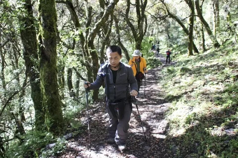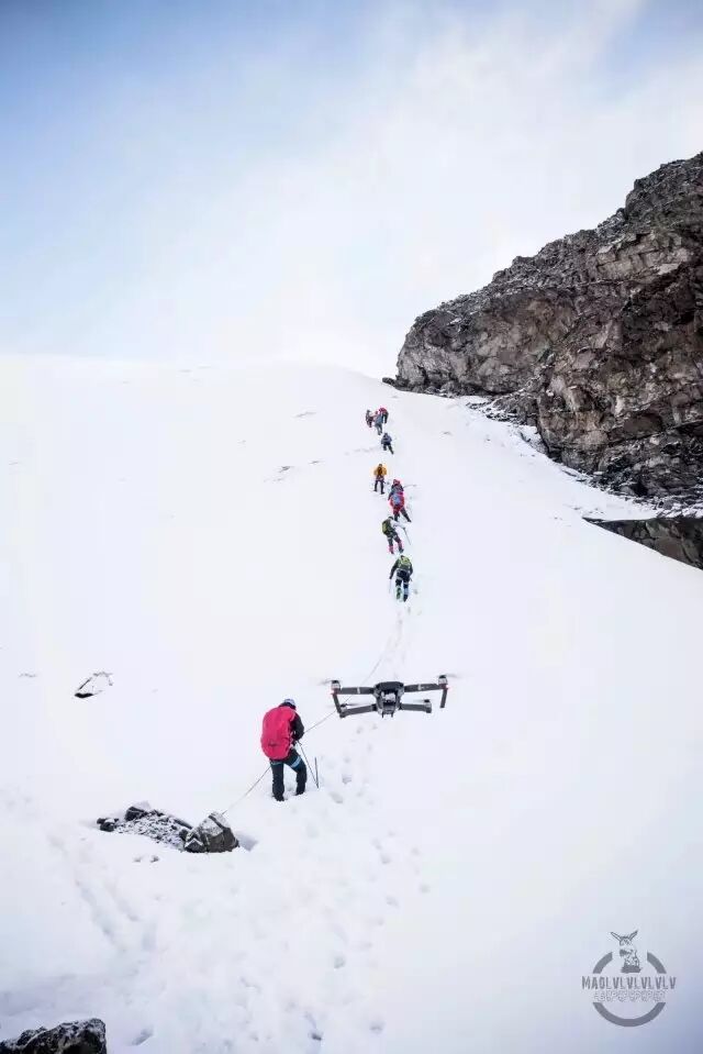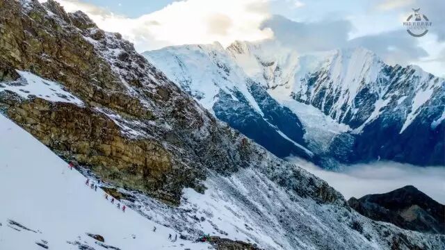 开始爬山,一行小队拉着协作队事先修好的路绳,往上爬啊爬啊爬,从远处看就跟蚂蚁搬家无异。