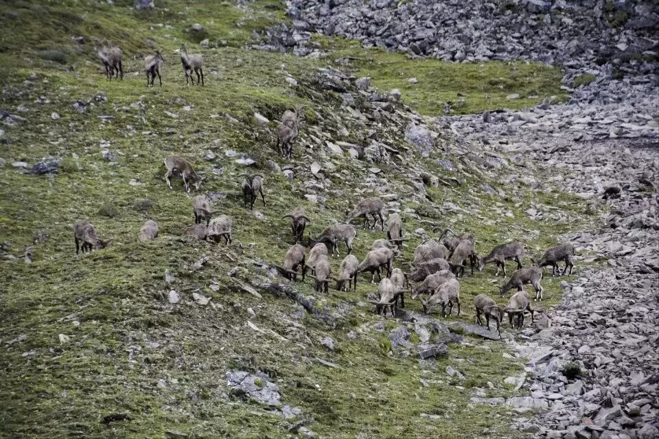 对面不知什么时候出现了一群野生岩羊想下来喝水,转眼间又不见了踪影。