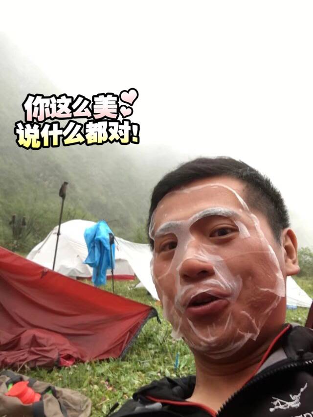 下午7点,终于到达了营地,陈程列夫他们已经扎好了营,我也简单的收拾了一下,挤进铁咪咪的帐篷开始敷面膜,保护一下我这水嫩净白吹弹可破的皮肤。