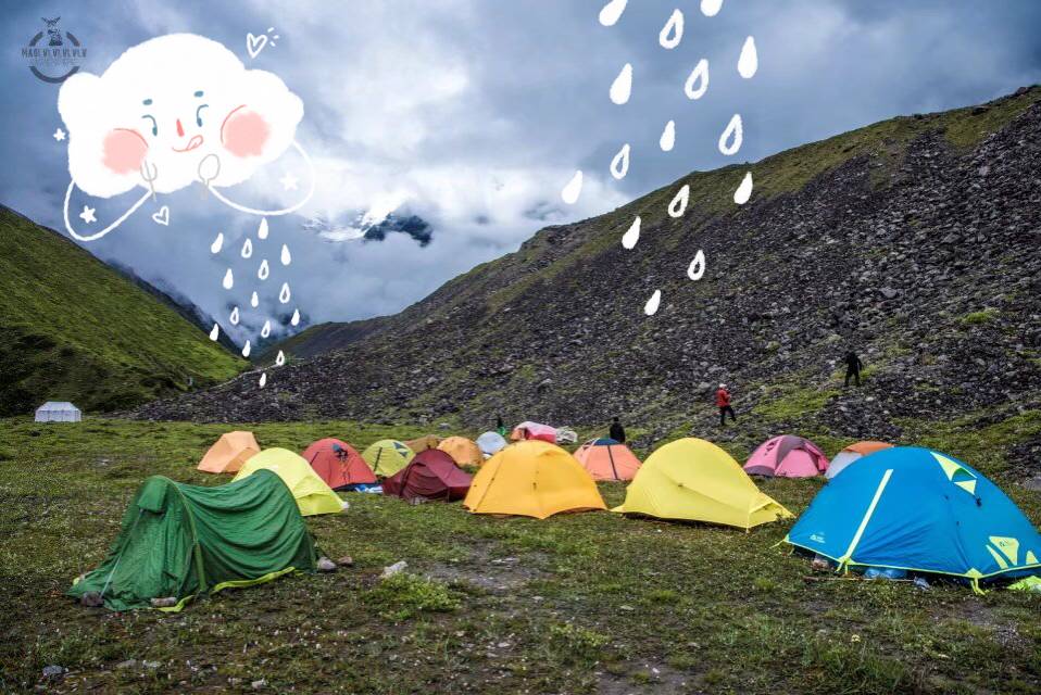 下午3点到达BC大本营,在离营地只有几十米的距离,天空开始下起了瓢泼大雨,心中一万只草泥马跑过,到底穿不穿雨衣啊!!!