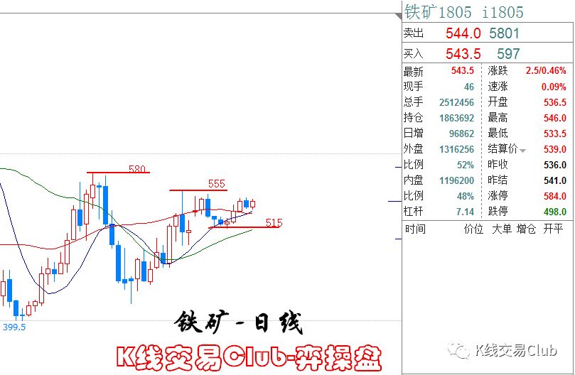 铁矿1805:目前铁矿价位站稳MA10 MA60 均线上方运行,60线为大周期均线,价格在60线上方运行,多头动力较强,但是目前铁矿的K线环境并没有体现出多头强的特征,价格走势比较纠结,导致投资者也没有方向可言,目前需要重点关注的点位是 上方压力555元和580元的价格压力,下方支撑515元,都是近期的重要压力支撑位置,投资者可以考虑选择做一下高抛低吸,压力支撑位附近做单,止损也非常小,操作起来就非常灵活了。
