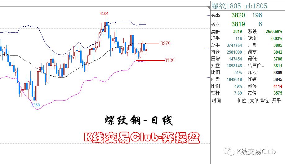 螺纹钢1805:今天我们使用之前没讲到过的指标来分析一下螺纹,那就是布林带(BOLL),布林带由上轨道,下轨道,还有中轴平均价组成,上轨是价格压力,下轨是价格支撑,价格如果在中轨与上轨之间运行,说明行情多头力量充足,如果在中轴与下轨之间运行,说明行情多头力量较弱,ok,那么看一下现在的螺纹钢 ,正是在中轴与下轨之间运行,说明多头比较弱,后市关注上方压力3870附近可以布局空单,下方支撑下轨附近3720附近为止盈位置,也是反手多单的位置。