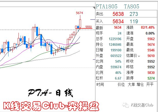 PTA1805:PTA今日的突破可以说是重要突破,已经突破从去年3月份至今的高点,短周期看上方已经没有任何的压力位置,大周期看前方压力位置应该在5800附近,能不能达到,我们不去猜测,但是不要轻易去猜顶放空,手里没有单子的,关注下方支撑5550附近机会,有单子的带好跟踪止损,拿住手里的单子即可。现在趋势已经很明朗了,做起来也非常的简单容易。