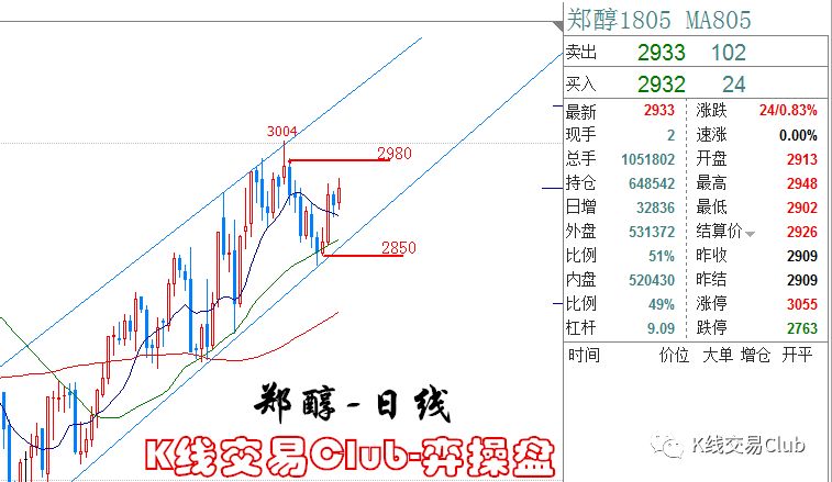 郑醇1805:今日虽然个别品种涨幅比较好,化工类的PTA涨幅也不错,但是郑醇今天的走势并不突出,依然处于弱势,前几周一直在强调过的,今天郑醇收小阳,成交量也跟上了,后市观察能否涨幅高地能否达到压力2980附近,形成空头信号时,采取高空策略,下方2850附近依然可以开多,保持昨日策略不变,震荡格局操作模式。
