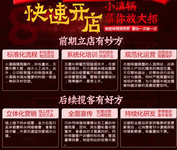 小滇锅米线产品独树一帜,已经在众多的消费者心中占据有一席之地。此外,其在经营模式上更是专业化,凭借在技术、策划、经营、管理、宣传等方面的成功经验和加盟开店运作方案等一体化流程管理,助力加盟商一臂之力。