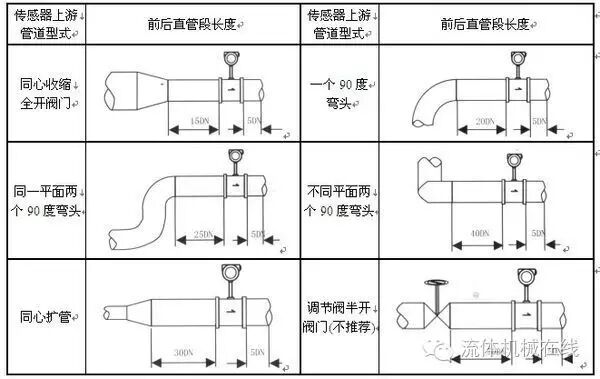 (3)涡街流量计对前后直管要求非常苛刻,流量计上游要保障有10到40倍管道直径,下游不小于5倍管道直径。上游直管长度由上游有无直角弯、扩大或缩径管而定。特别要注意的是,在满足要求的情况下,流量计应尽量选择安装在前后直管段尽量大的管道位置处。