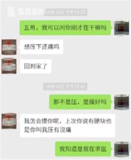韦女士:”他说你上次说你的胸部有结块,我帮你压一下,按一下看它还痛吗?我说我今天是过来治腰的,而不是治胸的,你压我的胸干什么,然后他至始至终都没有给我回复一个字。”