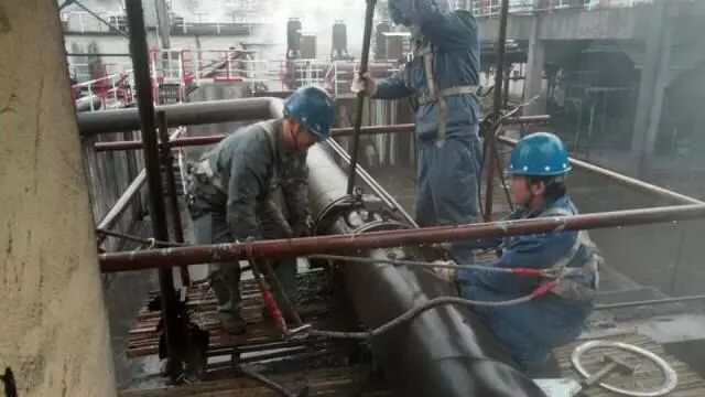 他们在搭好的脚手架上支起一把大伞,一人手拿着锤头敲击,一个又一个螺栓拆下,整整齐齐码在指定的安全位置,另一人递上扳手,他们相互配合,雨越下越大,雨水顺着检修人员的安全帽灌进脖子,工作服都湿透了,一阵风刮过来让人直打哆嗦。