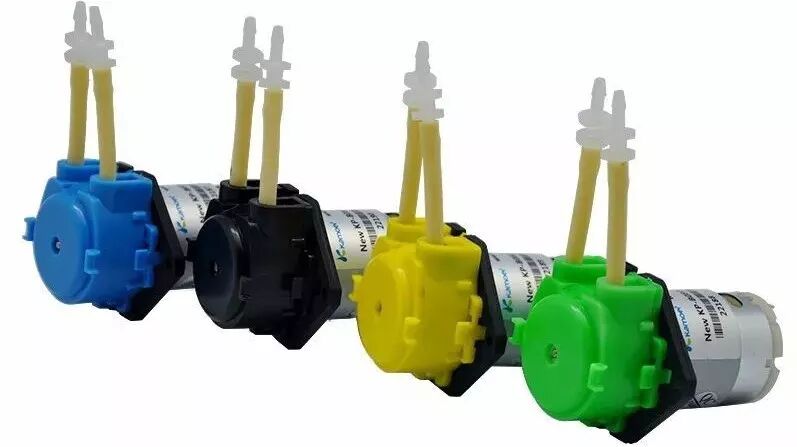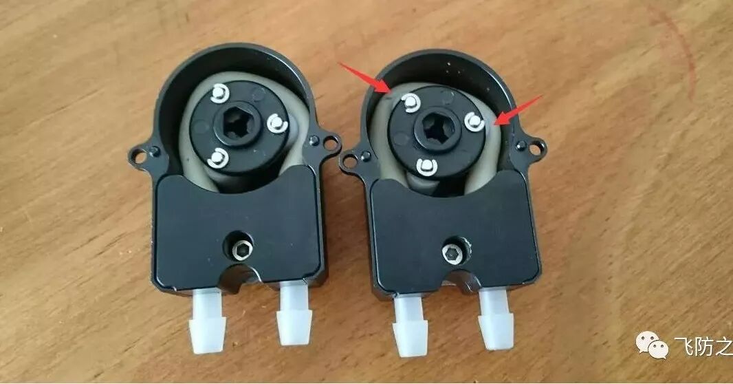 蠕动泵,植保新贵。                         蠕动泵由驱动器、泵头和软管三部分组成。蠕动泵寿命极长 维护简单 流量控制精度高 自带计量功能无需流量计也能精准计量。小型蠕动泵流量小,压力低,目前只能配合离心喷头使用。单泵流量难以满足植保机需求需要多个泵离心喷头组合工作。要驱动多个蠕动泵离心喷头组合工作难度较高。目前使用蠕动泵方案的机型屈指可数,此类喷洒系统配置在较高端的植保机上面。