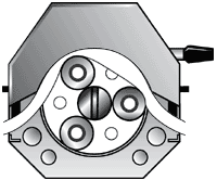 三角的转轮可以保证在任意一个停的位置都有2个转轮压着管子止流